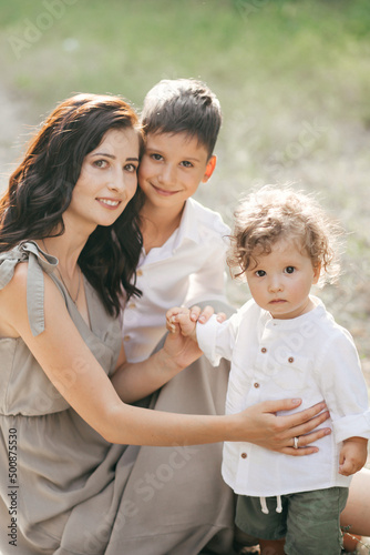 © Forewer, Fototapeta premium Happy young woman with children on wheat summer field. Happy motherhood.