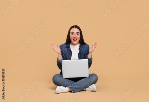 © New Africa, Naklejka premium Happy young woman with laptop on beige background