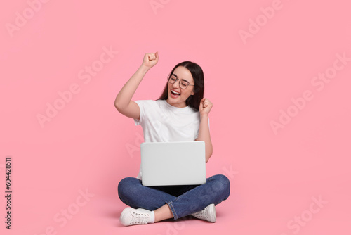© New Africa, Naklejka premium Happy young woman with laptop on pink background