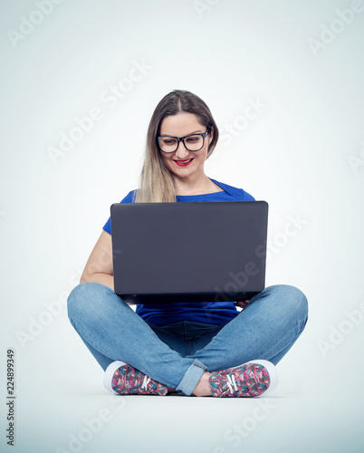 © afxhome, Naklejka premium Happy young woman with smile working or typing on laptop while sitting in lotus pose on the floor over light background