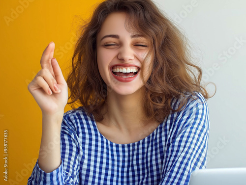 © Arif, Fototapeta premium Happy young women working in the office, sitting with a chair and enjoying success, looking at the laptop screen and showing a victory gesture with her hand