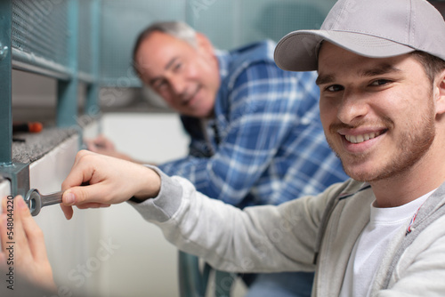 © auremar, Obraz premium happy young worker fasten the handle to a plastic window