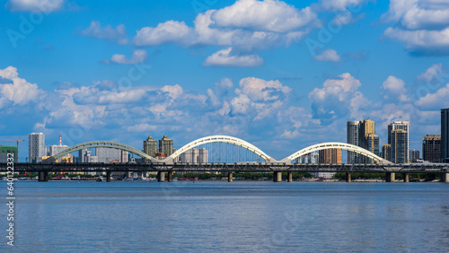 © YOUMING VISION, Naklejka premium Harbin Songhuajiang Highway Bridge. Cityscape of Harbin, China. Bridge with blue sky and white clouds in sunny day.