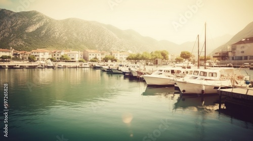 Fototapeta premium Harbor and boats at sunny day. Illustration AI Generative.