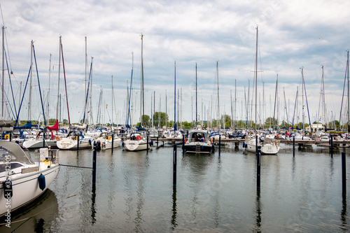 Fototapeta premium Harbor full of pleasure yachts and sailing boats in the village of Makkum in the Netherlands, province of Friesland