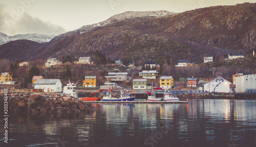 © Елена Нестерова, Fototapeta premium Harbor in a little fisherman village with moored boats and yachts with snow-capped peaks in the background.