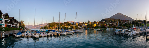 Fototapeta premium Harbor of Spiez, lake Thun, Switzerland, with boats (Panoramic view)