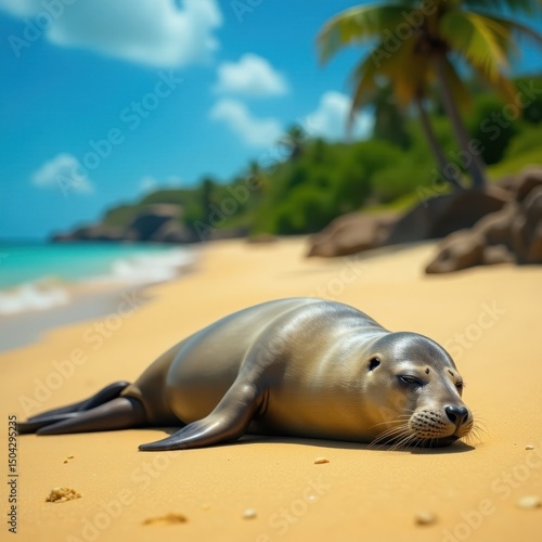 Fototapeta premium Harbor seal naps on golden sand, palm trees in background, fauna, mammal, sealife