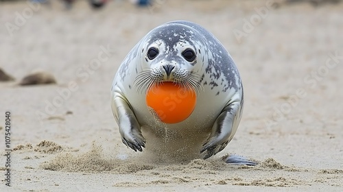 Obraz premium Harbor Seal Playing with an Orange Ball on a Sandy Beach