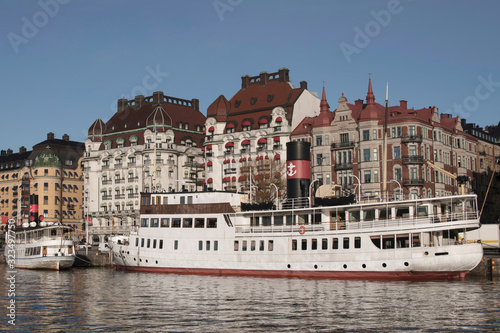 © Hans Baath, Naklejka premium Harbor view with boats and residential houses at the waterfront of the district Östermalm in Stockholm a sunny winter day