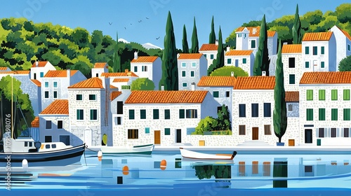 © Anna, Obraz premium Harbor with Boat & Row of Houses