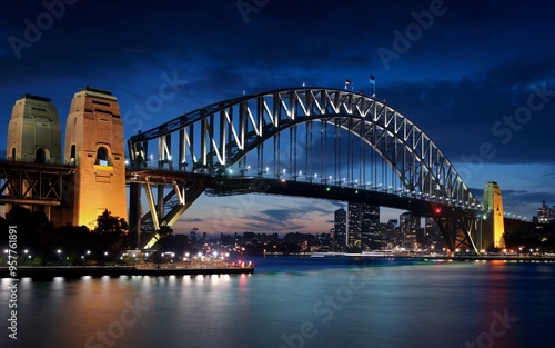 © BackgroundStudio, Obraz premium Harbour Bridge at Night: Illuminated Sydney Skyline with Reflections Background