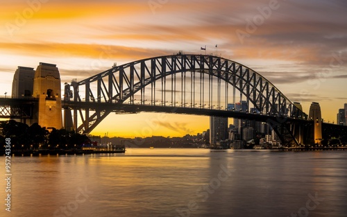 Fototapeta premium Harbour Bridge Sunset Silhouette: Dramatic Sydney Skyline Background