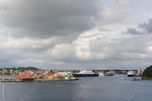 © piotrmilewski, Fototapeta premium Harbour in Stavanger, Norway on a cloudy day with a suspension bridge, boats and ferries in the North Sea