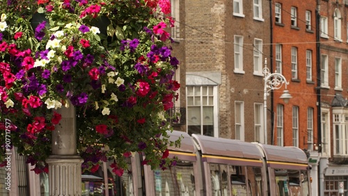 Obraz premium Harcourt Street, Dublin. Flowers and with Terraced Georgian buildings and tram