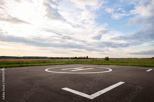 © goodmoments, Fototapeta premium Hard surface for helicopter landing. Symbol for precise helicopter landing in the center. Evening landscape