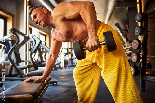 Naklejka premium Hard-working male athlete doing physical exercises at gym
