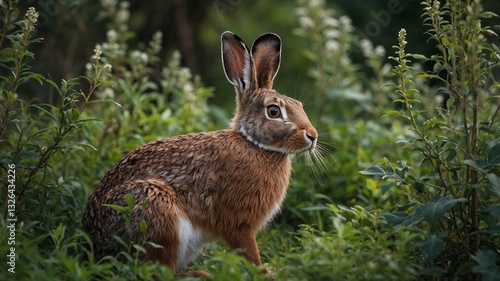 Fototapeta premium hare sitting in tall grass during summer in a natural setting