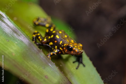 Obraz premium Harleking poison dart frog sitting in a bromeliad