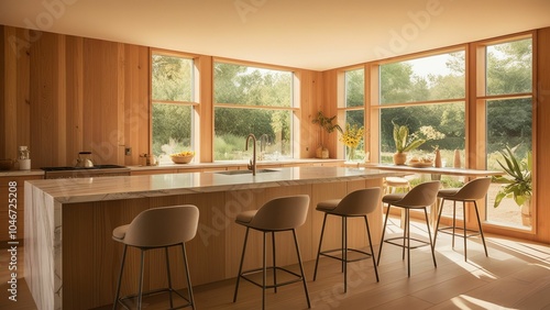 Obraz premium Harmonious Blend of Warm Wood and Sleek Marble in Modern Kitchen