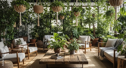 Obraz premium Harmonious indoor oasis a lush interior space with abundant greenery comfortable seating and natural light creating a serene and inviting atmosphere with a focus on plant life and design harmony