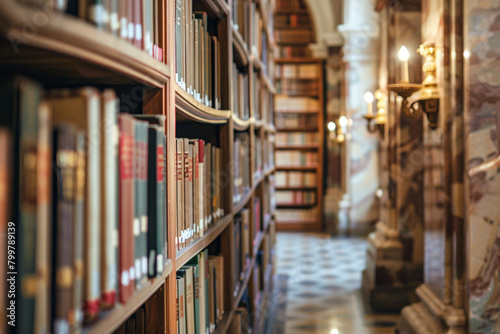 © Tahir, Obraz premium Harmonious Italian wall sconces in a library setting, highlighting the rows of books and architectural features.