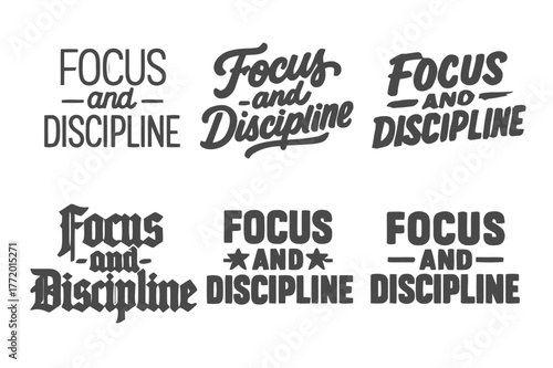 © Svitlana, Fototapeta premium Harmonious Lettering Variations. Focus and discipline. Set lettering. harmonious lettering variations of the same emblematic concept, each with different