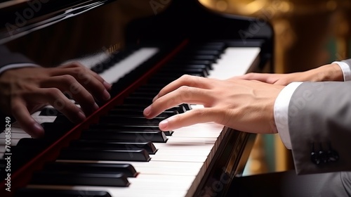 Fototapeta premium Harmonious Melodies: Captivating Hands Dancing Across the Ivory Keys of a Grand Piano