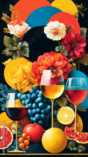 Naklejka premium Harmony of Wine and Fruits: A vibrant arrangement featuring diverse glasses of wine alongside an array of fresh, colorful fruits, flowers, and a splash of artistic geometric shapes.