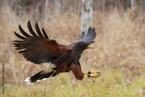 Obraz premium Harris Hawk doing flight demonstrations at Falconry experience in late fall...