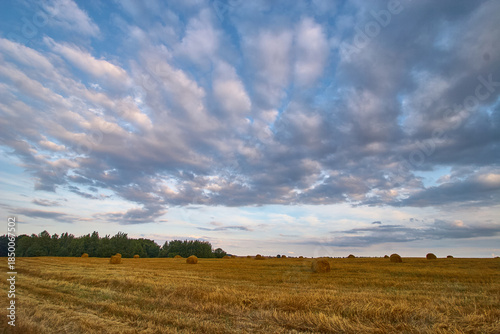© Maryia, Fototapeta premium Harvest Field with Hay Bales Under Dramatic Cloudy Sky