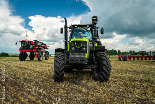 © diy13, Obraz premium harvest field with red tractor mods dry grass. field after harvest. Harvesting in the fields. Stock up on hay for winter. plowing a field with a red tractor. tillage
