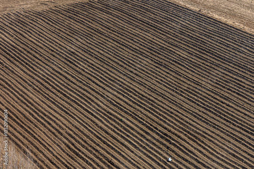 © Михаил Шорохов, Fototapeta premium Harvest-ready Farmland Showcasing Beautifully Plowed Soil Patterns Under the Warm Afternoon Sun in a Tranquil Rural Setting