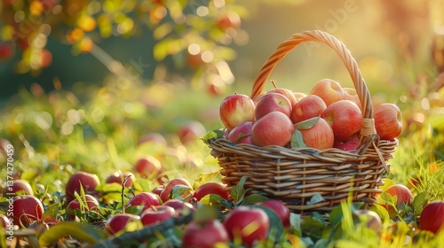 © neirfy, Obraz premium Harvest Time A Bountiful Collection of Fresh Red Apples Nestled in a Rustic Basket Surrounded by Colorful Autumn Leaves