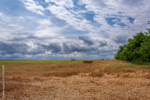 © balogh, Fototapeta premium Harvested field with hay bales under a dramatic cloudy sky