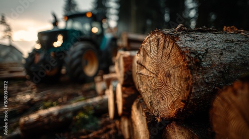 © Kate Mova, Fototapeta premium Harvested Timber Stacked with Logging Machine in Background