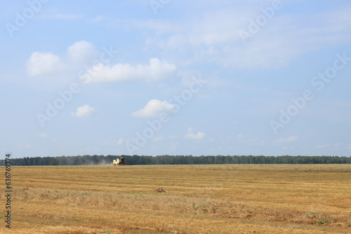 © MIKHAIL BATURITSKII , Obraz premium Harvester harvesting crops on a sunny summer day