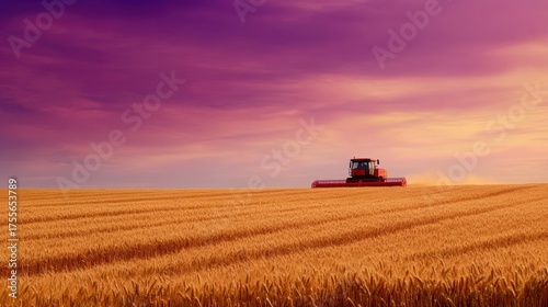 © Berkah, Fototapeta premium Harvester silhouetted against the sunset sky in a golden wheat field