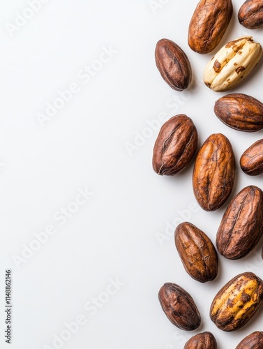 © Nipa, Obraz premium Harvesting cacao beans white background photography studio close-up cocoa purity