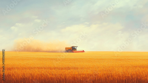 © Nelson, Fototapeta premium Harvesting Golden Wheat in a Vast Field Under a Cloudy Sky