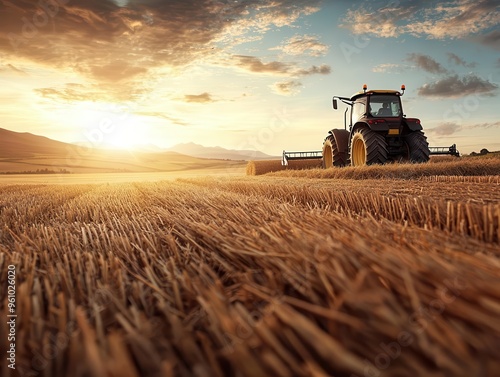 © Creator88, Fototapeta premium Harvesting hay on a warm summer day, with the sun setting behind a tractor, Realism, Earthy warm hues