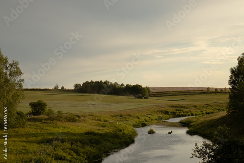 © Ксения Ульянова, Obraz premium Harvesting. The combine harvester is in operation. The combine harvester harvests on the field. A wide field, a river and a combine harvester collects grain.