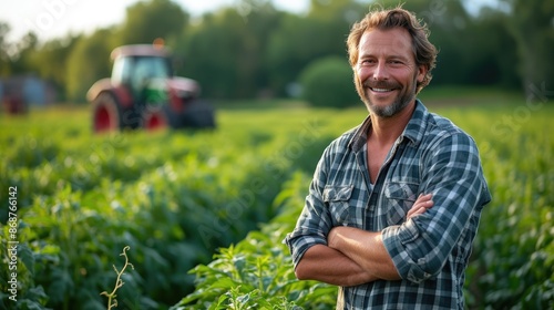 © Andrii , Fototapeta premium Harvesting Tomorrow: Farmer with Technology in Crop Field