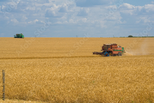 Obraz premium Harvesting wheat harvesters