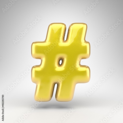 © Whitebarbie, Obraz premium Hashtag symbol on white background. Yellow car paint 3D sign with glossy metallic surface.