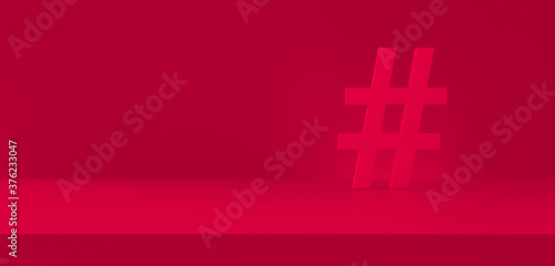 © ImagesRouges, Obraz premium Hashtag symbol red in photography studio background. Trending topics, trends. 3d rendering.