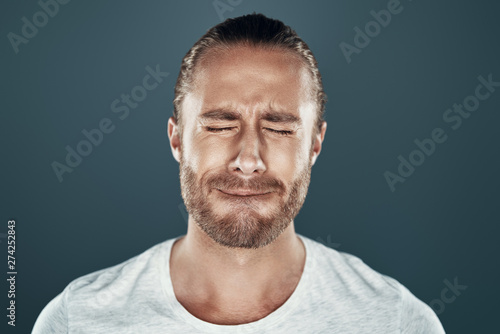 Fototapeta premium Hate to lose. Sad young man keeping eyes closed and making a face while standing against grey background