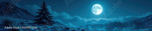 Fototapeta premium Haunted evergreen tree silhouetted against a full moonlit sky with frosty landscape, frosty, moon, night