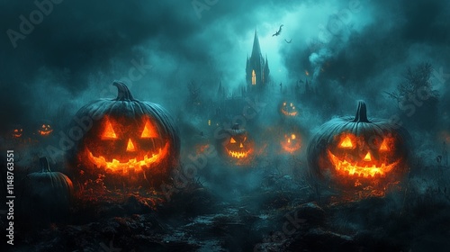 Fototapeta premium Haunted Forest with Glowing Jack-o'-Lanterns and Spooky Castle