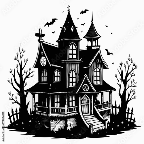 © inspiring , Obraz premium Haunted Gothic House with Bats and Trees in Black and White Illustration